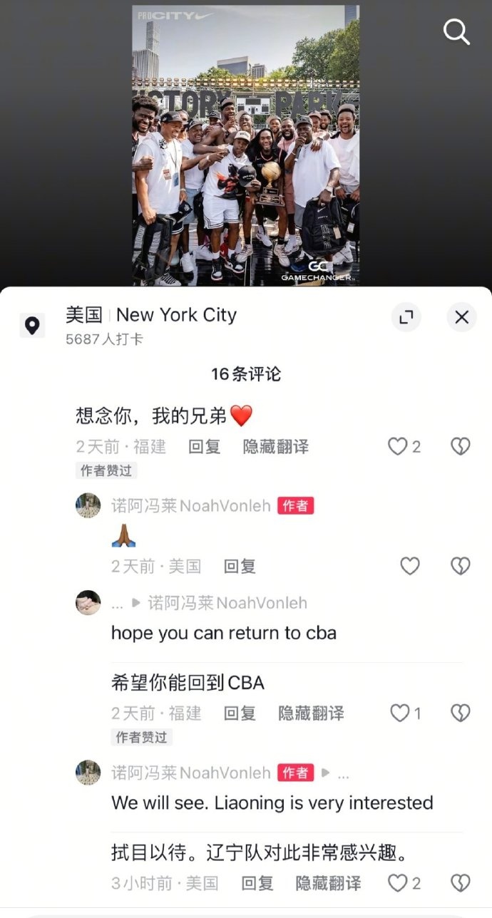 8月26日讯 近日,前CBA外援冯莱在社媒和网友互动。他表示,辽宁对自己非常感兴趣。